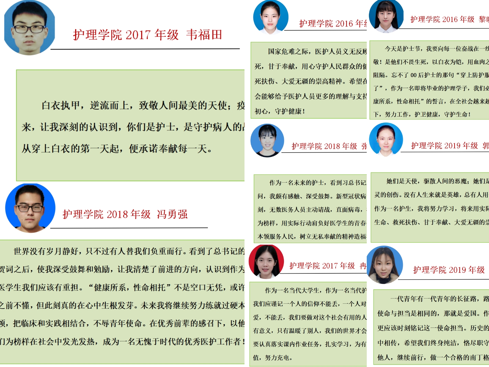 习近平总书记对全国广大护士的祝福和慰问,带给护理人员极大的鼓舞,同时也为护理工作明确了方向,坚定了信心。没有从天而降的英雄,只有挺身而出的凡人。作为蚌医护理学子,我们不忘初心,砥砺前行,以梦为马,不负芳华,誓用青春守护健康,用实际行动诠释当代护理学子的责任和担当!