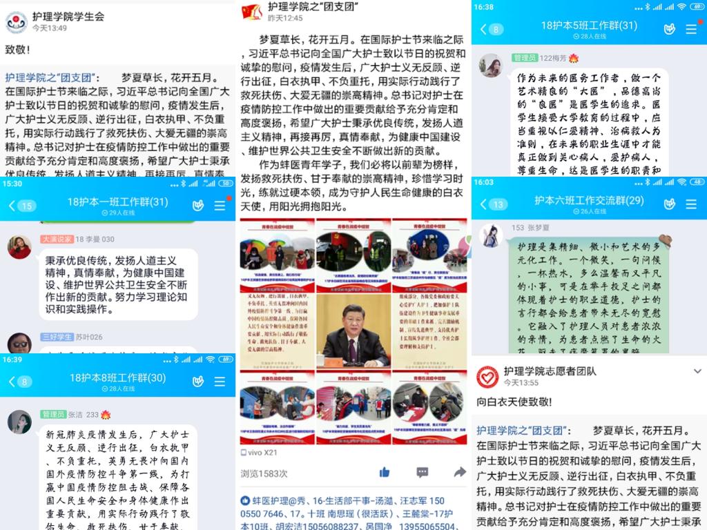 热议活动以班级为单位,以院学生会、院青年志愿者协会、院团支团QQ空间,班级QQ群等为平台,针对慰问内容、结合当前疫情防控,引发护生对青年的责任和担当进行思考,从而进一步坚定理想信念,树立正确的职业观。同学们纷纷表示:作为未来白衣天使,我们必将以前辈为榜样,发扬救死扶伤、甘于奉献的崇高精神,珍惜学习时光,练就过硬本领,成为守护人民生命健康的白衣天使努力奋斗。