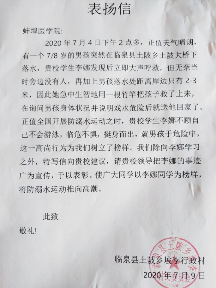 2018年级学生李娜在家乡安徽省阜阳市临泉县土坡乡土坡大桥桥下成功救下一名不幸落水面临溺水危险的8岁男孩。她说:“当时我正在大桥下的岸边摘菱角,突然间听到“扑通”一声,发现距离我大约两米远有个男孩在水里扑打求救,面临溺水危险。当时立刻大声呼救但没人回应,因为我不会游泳,于是就在旁边找了一根竹竿对男孩进行施救,最终成功将小孩救起。虽然当时我非常害怕,但我始终牢记自己是一名医学生,救死扶伤、敬畏生命是我们的担当与使命”。李娜同学的先进事迹得到了当地政府的表扬和肯定。作为年级学习委员、学习帮扶团和创新创业团负责人、国家励志奖学金获得者、院优秀青年,品学兼优的她也是年级同学一直学习的榜样。