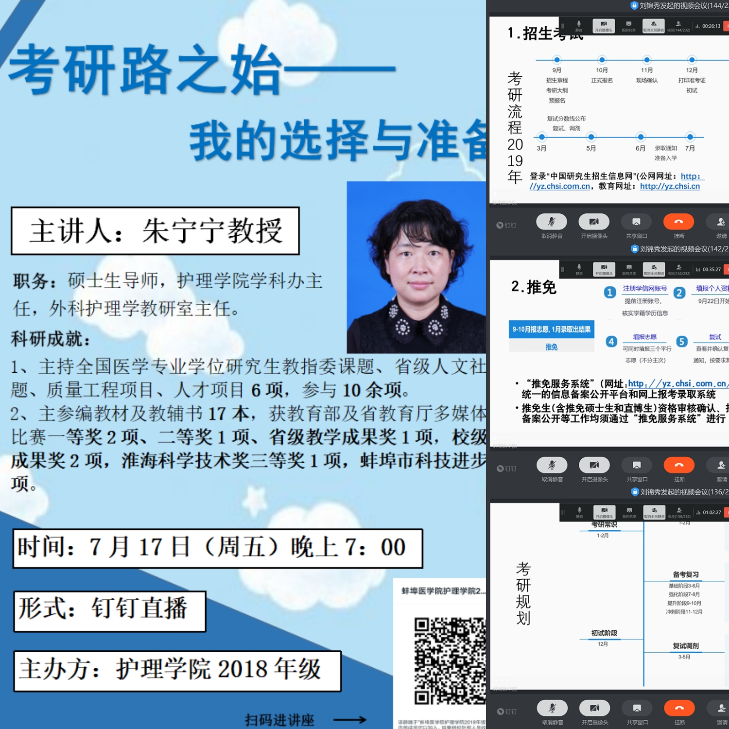 2018年级于7月17日晚7:00利用钉钉视频会议举办了题为“考研路之始——我的选择与准备”专题讲座,吸引了年级有考研意向的同学共计146人参与。