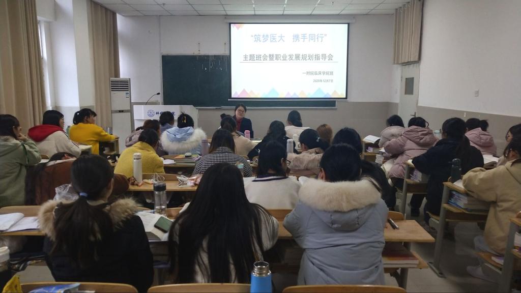 本次主题班会分校本部、一附院临床学院班和二附院临床学院班三个地点8个场次召开。年级辅导员通过现场调研和座谈引导同学们结合自身的条件和现实环境进行自我综合评估,科学的确立自己的职业发展目标,选择有效且可行的职业道路,树立“先就业再择业”的就业择业观,当第一目标不能在第一时间达成时要采取迂回战术逐步实现最初的目标。同时还为同学们分析讲解了近年专业就业形势、各区域招聘情况、信息获取途径等信息,分享了优秀学长学姐的求职经历和经验,以及在求职道路上遇到的诈骗风险,也提醒同学们不要好高骛远,要端正态度,早规划、早准备,奠定扎实的专业基础,提升个人综合能力和素质,要将自己培养成为高“双商”人才,以便符合社会对综合型人才的需求。最后,辅导员针对疫情防控常态化下的管理要求和安全防护、诚信考试和积极心态备考、宿舍消防安全宣教和安全隐患排查等内容做了进一步的强调。