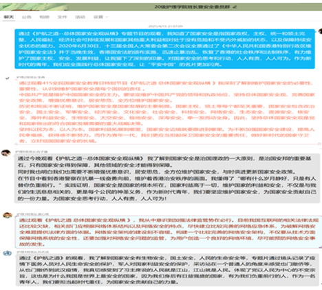 4月15日晚,年级老师和各班安全委员组织全体学生收看央视综合频道国家安全专题宣传片《护航之道——总体国家安全观纵横》。观看结束后同学们在班级工作群中展开讨论,“维护国家安全,我们应该怎么做? 第一,我关心,关心国家安全;第二,我知晓,知晓国家安全相关的权利与义务;第三,我掌握,掌握应对安全风险的能力;第四,我参与,主动参与维护国家安全。”“任何个人和组织不得有危害国家安全的行为,不得向危害国家安全的个人和组织提供任何资助和协助。”“人人安全,国家有责;国家安全,人人有责。”同学们沟通不断,踊跃发言。
