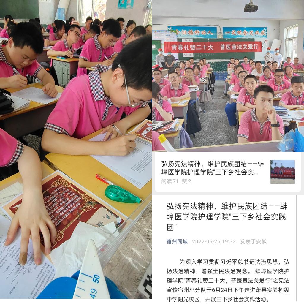 “青春礼赞二十大,普医宣法关爱行”之宪法宣传宿州小分队于6月24日下午在萧县实验初级中学阳光校区开展三下乡社会实践活动。