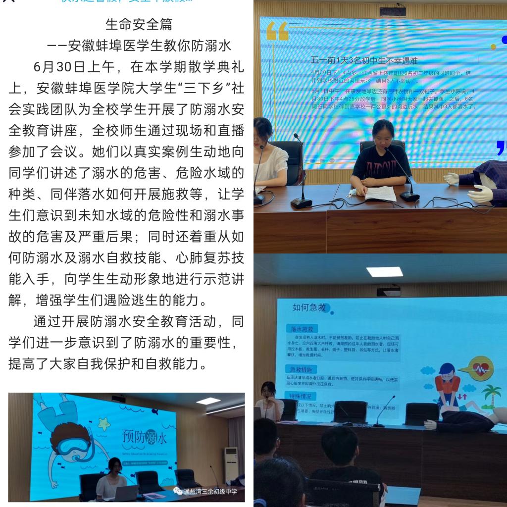 “生命护航”健康宣教社会实践小分队不仅丰富了师生们的急救知识,也帮大家树立了正确的急救观念。该团队将继续开展健康科普知识进校园、进社区活动,面向社会开展系统化、规范化、全方位的健康教育与健康宣传,做好人民群众的健康守护者。通州湾三余初级中学微信公众号以《安徽蚌埠医学生教你防溺水》为题,对本次活动进行宣传报道,进一步展现蚌医学子“普医宣教,奉献社会”的良好风貌。