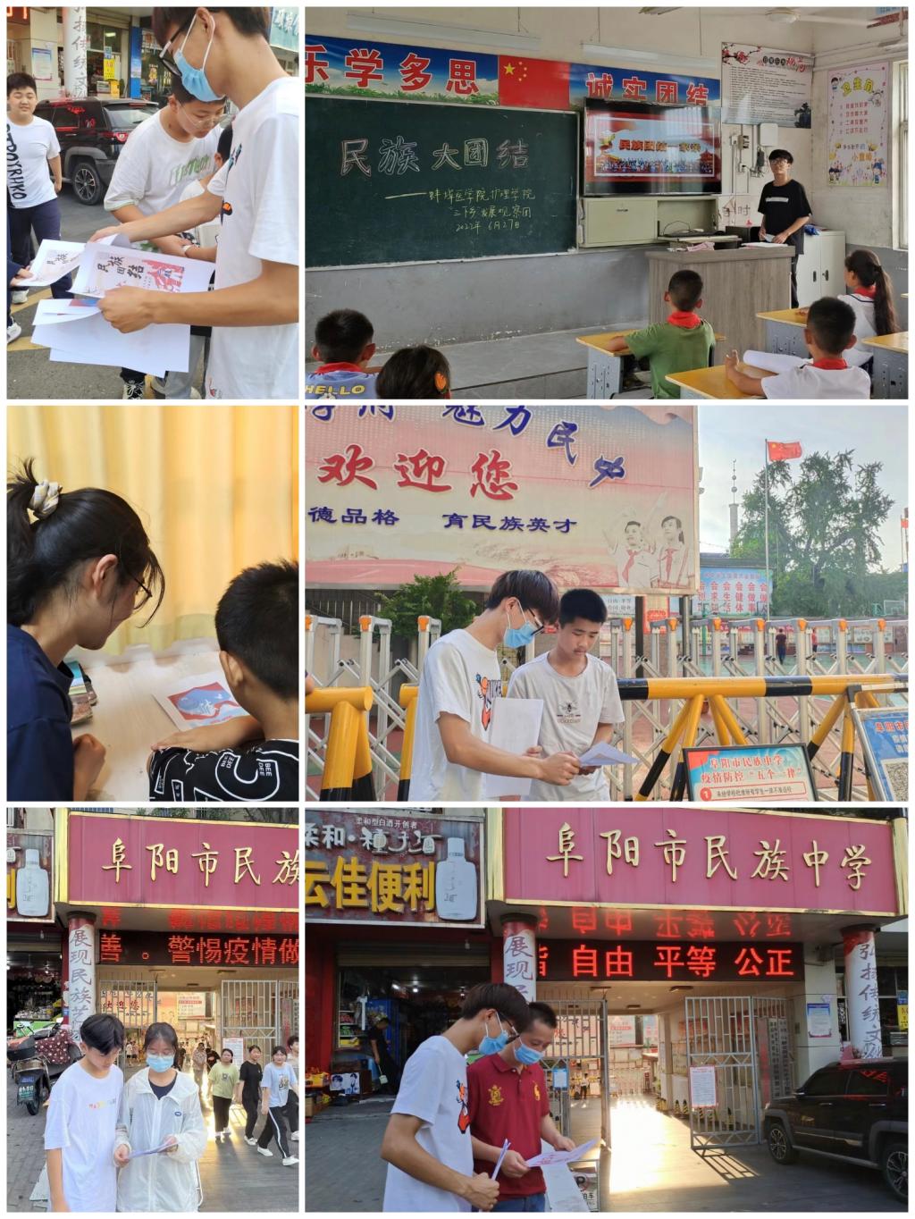 为全面贯彻落实习近平新时代中国特色社会主义思想和党的十九大精神,结合法治中国和实施“七五”普法规划,深入基层开展法律法规宣传,弘扬法治精神,提升广大青年学法懂法守法护法意识。6月26日社会实践团队成员们走入阜阳市民族中学、留守儿童家、颍东区新华办事处付寨小学开展民族团结知识宣讲和宪法宣讲活动(见图五、图六)。
