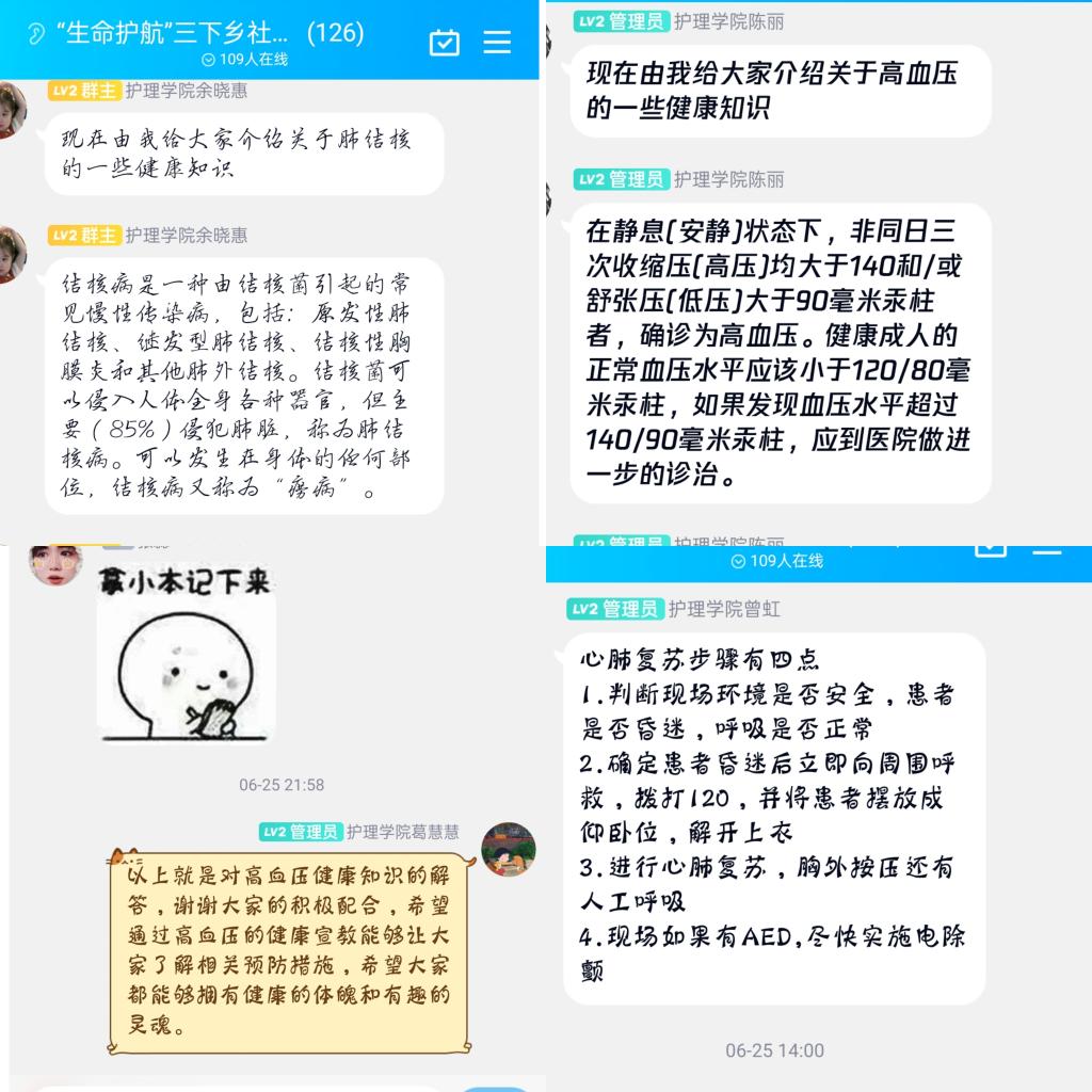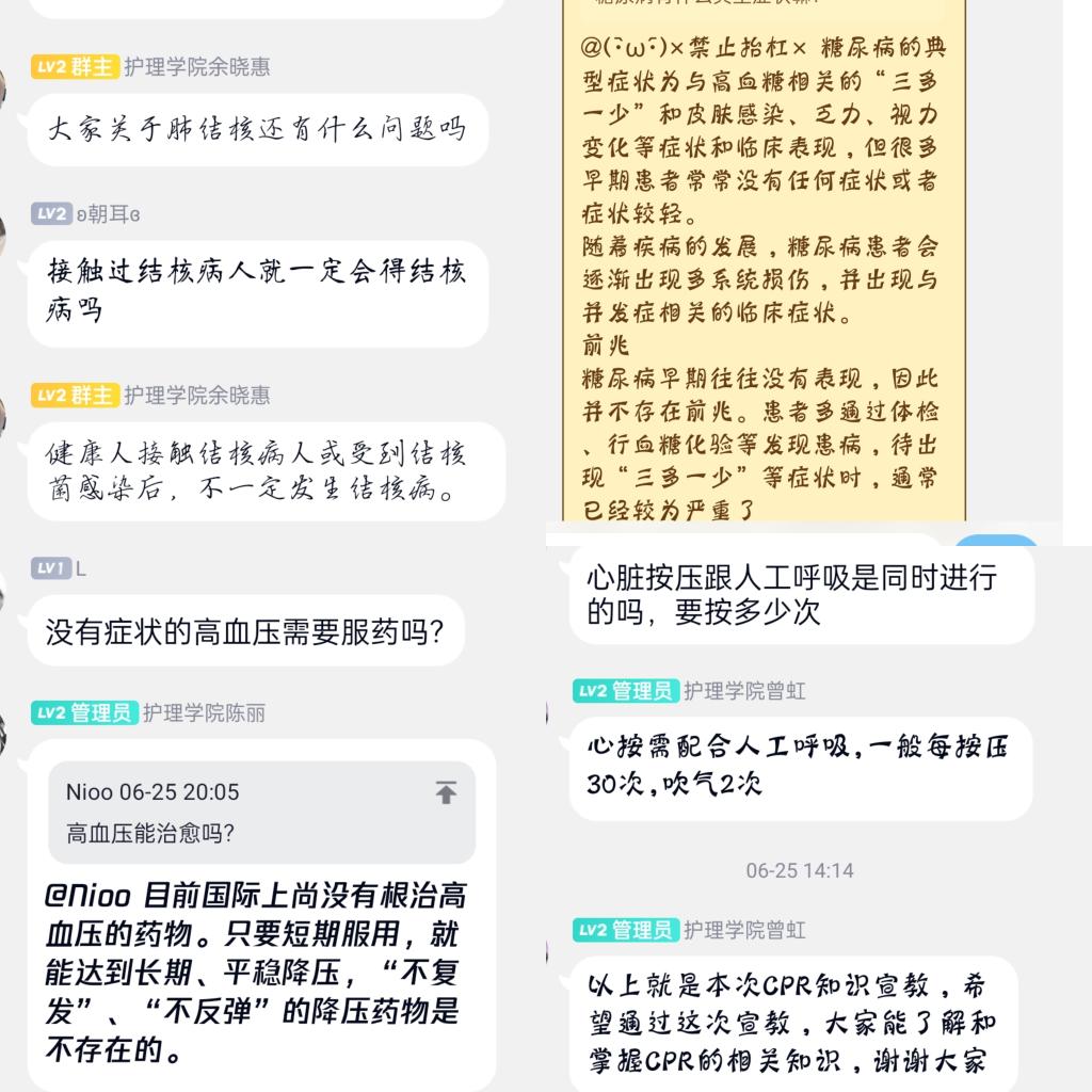 团队成员着重强调青年人应树立法治意识,将学习宪法知识与生活实际相结合,将宪法知识内化于心,外化于行。宪法内容主要有CPR技术的注意事项、肺结核、高血压、糖尿病的主要症状和预防措施。在宣教过程中,同学们积极互动,主动发表自己的学习感悟,展示了新一代青年的蓬勃活力,加深了青少年对宪法知识的认识,同时进一步加强了同学们对健康理念了解,提高自我保健能力。