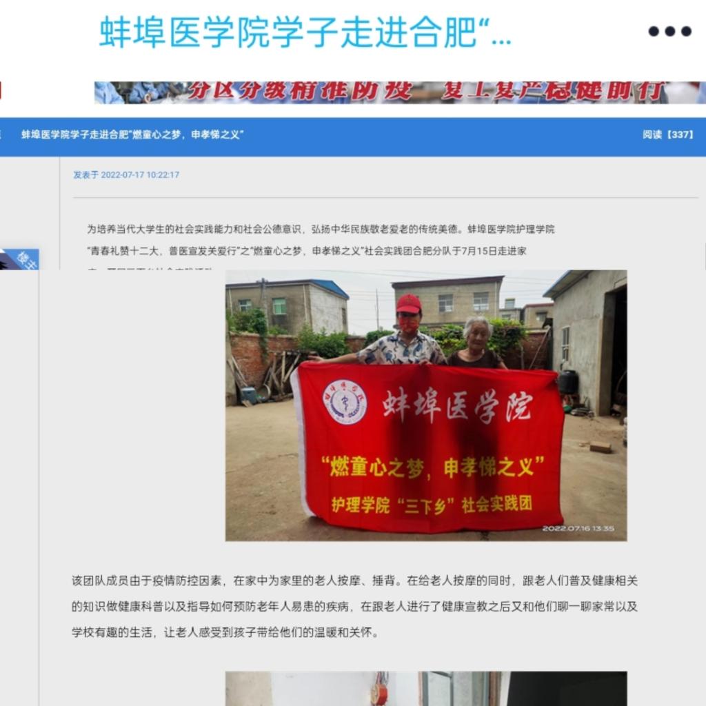 “青春礼赞二十大,普医宣法关爱行”之“燃童心之梦,申孝悌之义”社会实践团合肥小分队于7月15日至7月17日走进留守老人家庭,开展“三下乡”社会实践活动。