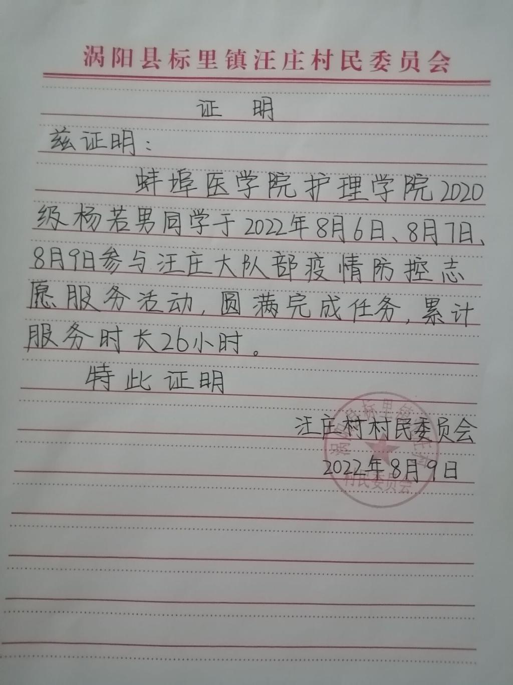 2020年级学生杨若男同学奋勇争先,主动担当。8月6日至13日,在安徽省亳州市涡阳县标里镇汪庄大队部积极响应大队领导的号召,在领导的悉心指导和照顾下,开展了志愿者的工作。前期完成核酸采样点布置、核酸信息采集、老年人防控疫情宣教等工作,后期负责家乡的核酸人员采集工作。