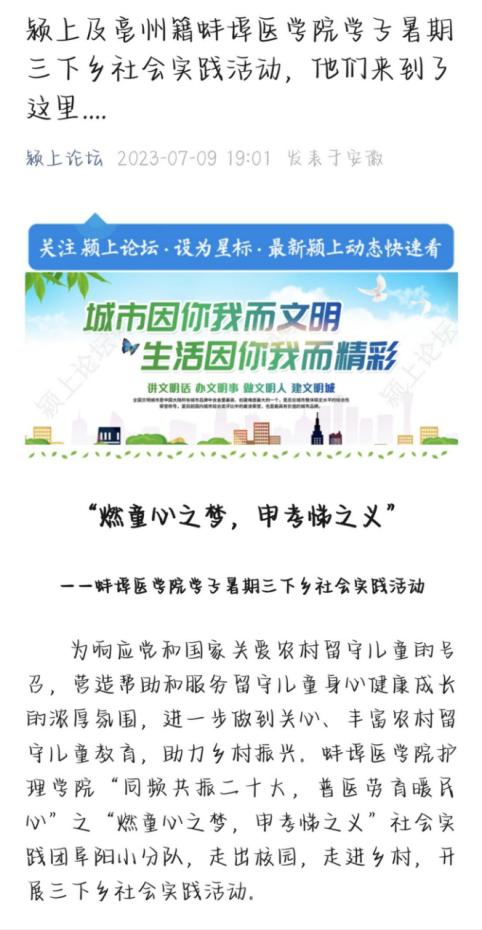 “情系留守儿童,助力乡村振兴”。通过此次三下乡活动,把党的政策和党的温暖带到农村,给孩子们送去更多的关爱。同时,“颖上论坛”微信公众号以《颖上及亳州籍蚌埠医学院学子暑期三下乡社会实践活动,他们来到了这里…》为题对本次活动进行宣传报道,倡导社会各界加强对农村留守儿童的关注和认识,彰显蚌医学子“点亮童心,筑梦未来”的良好风貌。