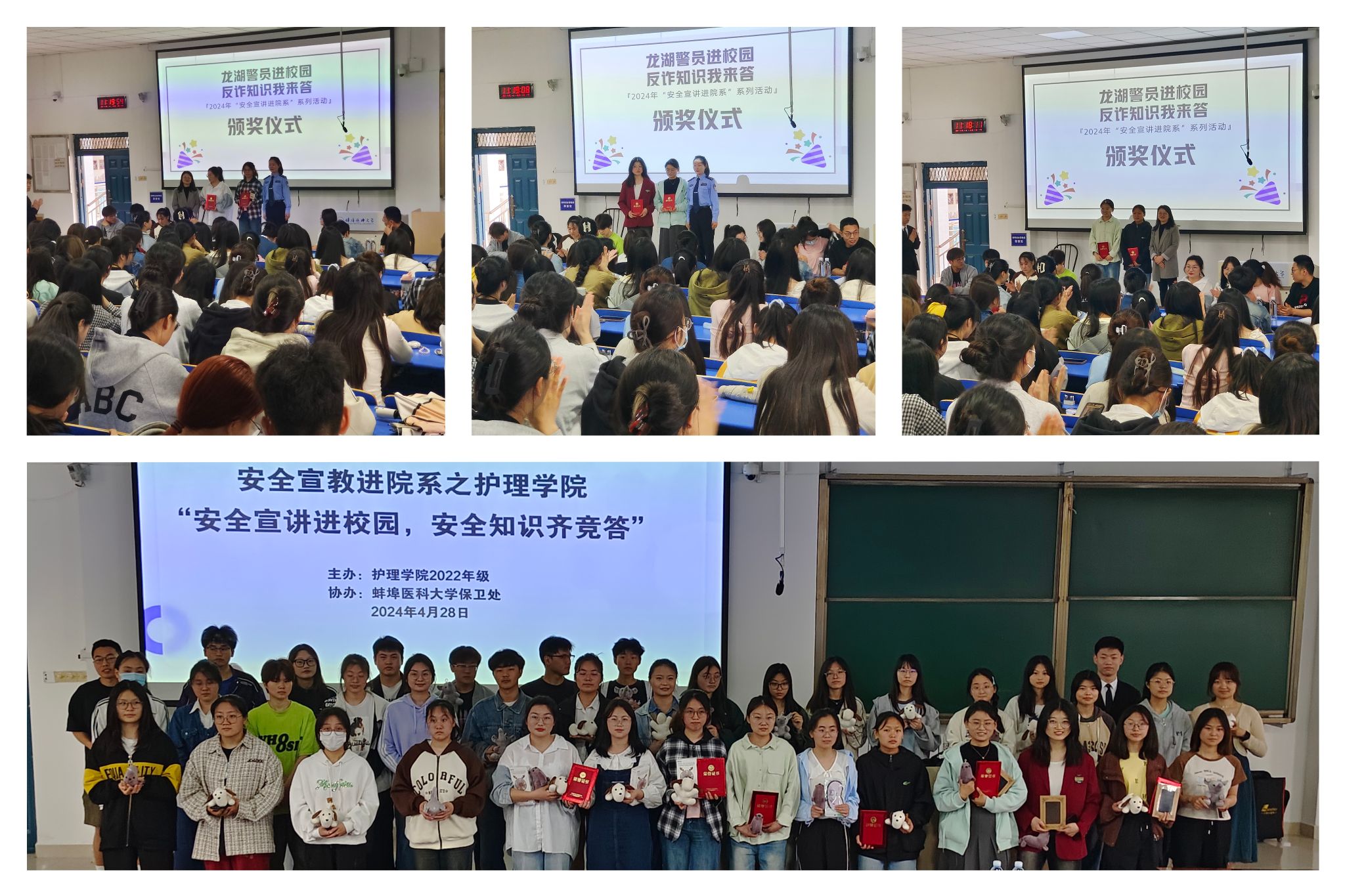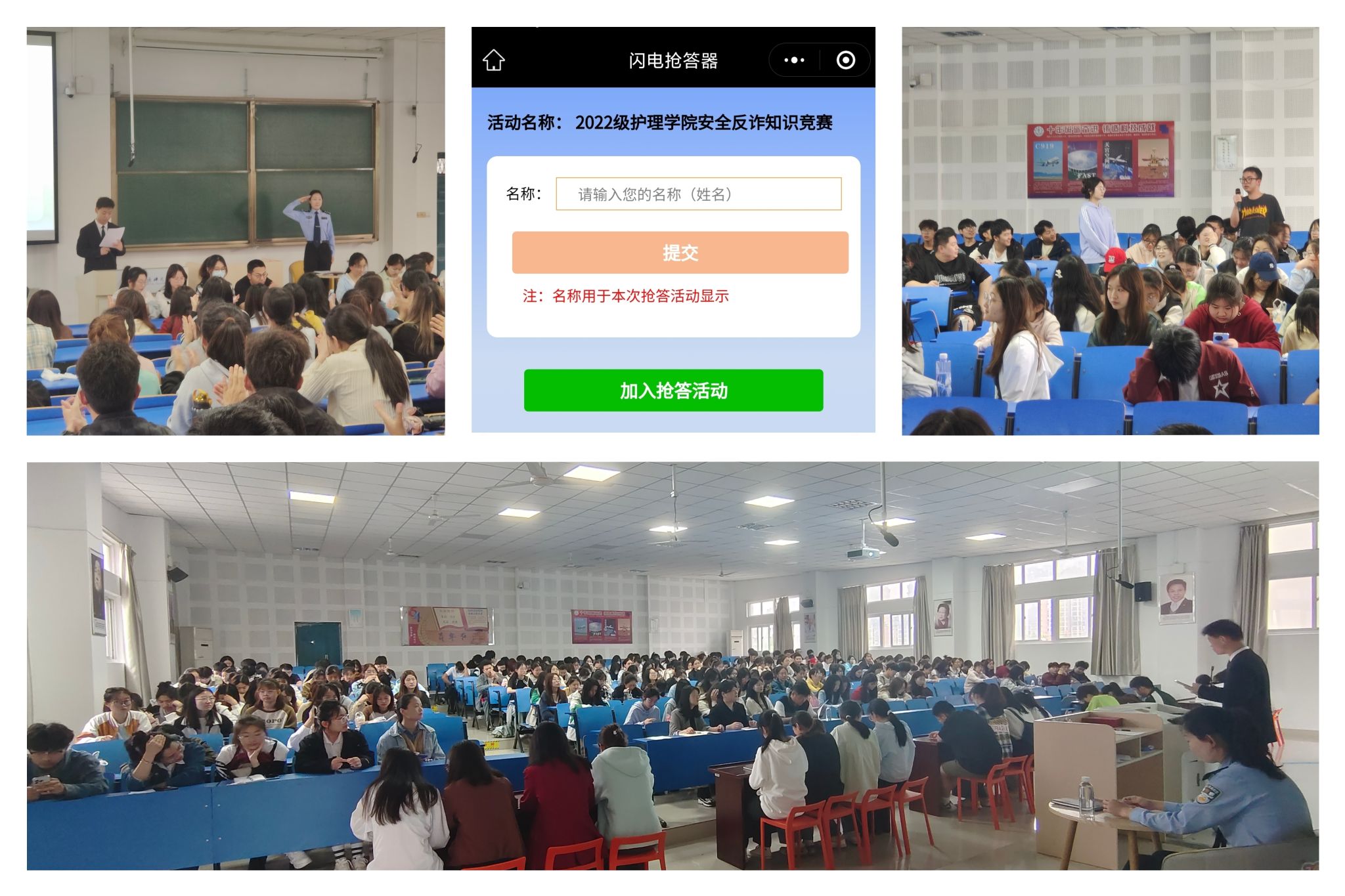 2022年级主办,校保卫处协办之“安全宣讲进校园、安全知识齐竞答”主题宣教活动如期开展。本次活动邀请到龙湖派出所陈依依警官和校保卫处副处长王兆先、学院党委副书记朱宁宁,以及年级辅导员和护理、助产专业297名同学共同参与。