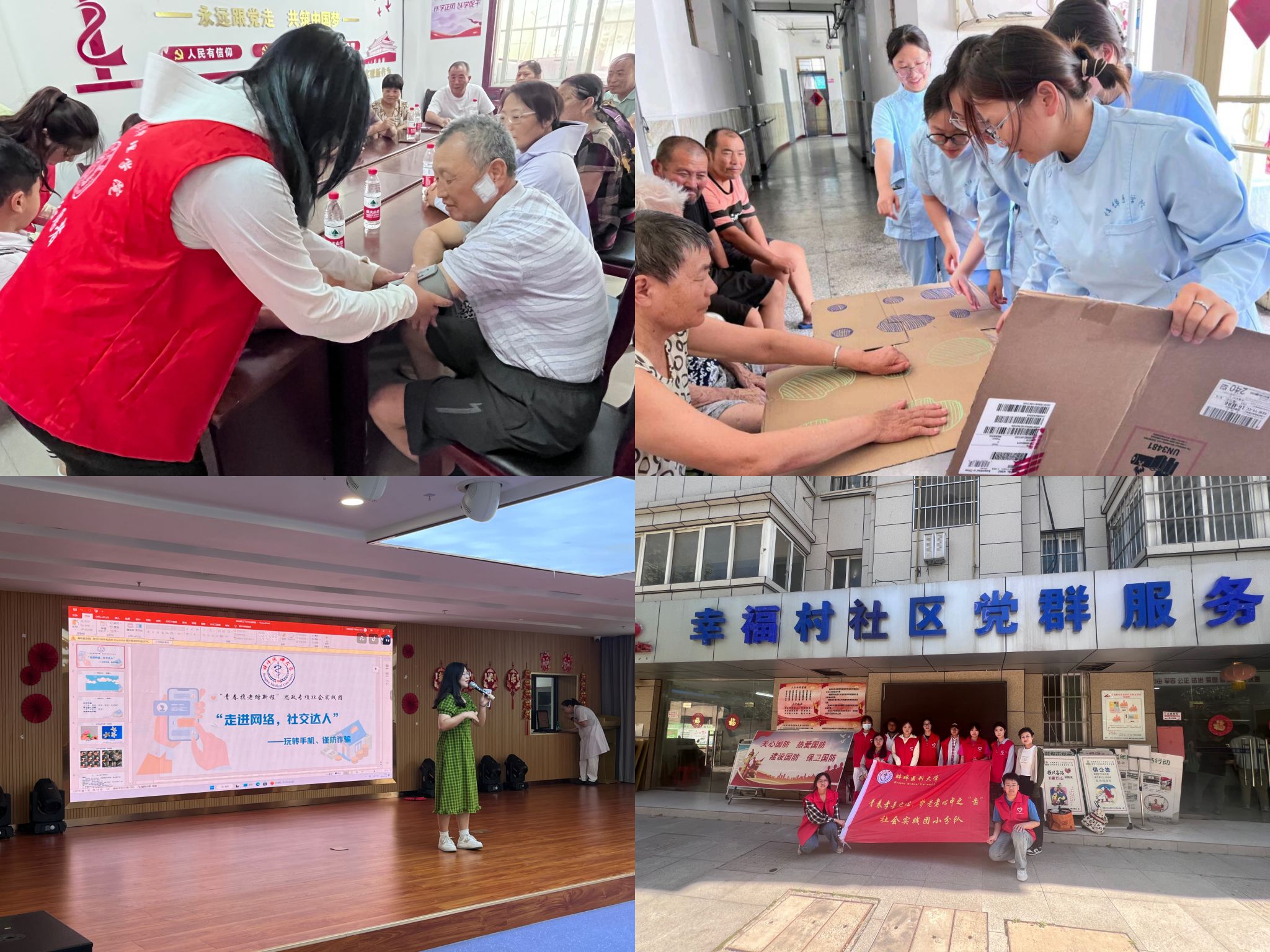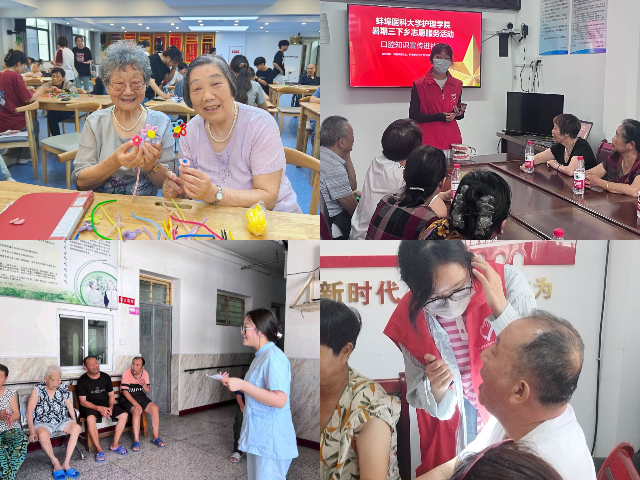 “青春携老踏新程”思政专项社会实践团以“提升老年人健康素养,为老年人生活增添色彩,传递青春力量与关怀”为宗旨,于7月5日、6日来到蚌埠市老年康复医院、幸福村社区、龙湖老年保健公寓等场所积极开展系列社会实践活动。