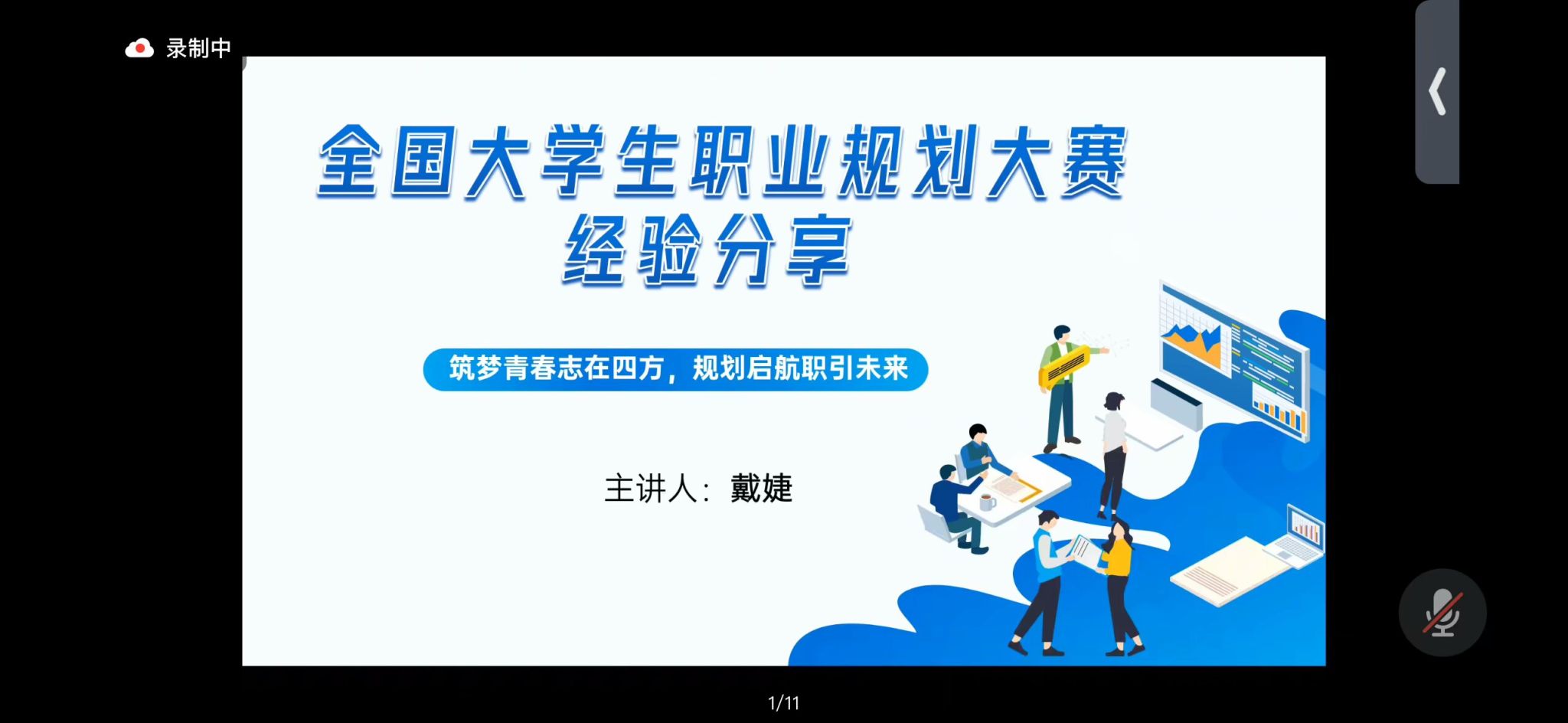 于11月2日晚上7点30分在腾讯会议上举行了全国大学生职业规划大赛经验分享会。会议由学生会主席团成员陆思雨主持,2021级省赛金奖获得者戴婕主讲,肉视频