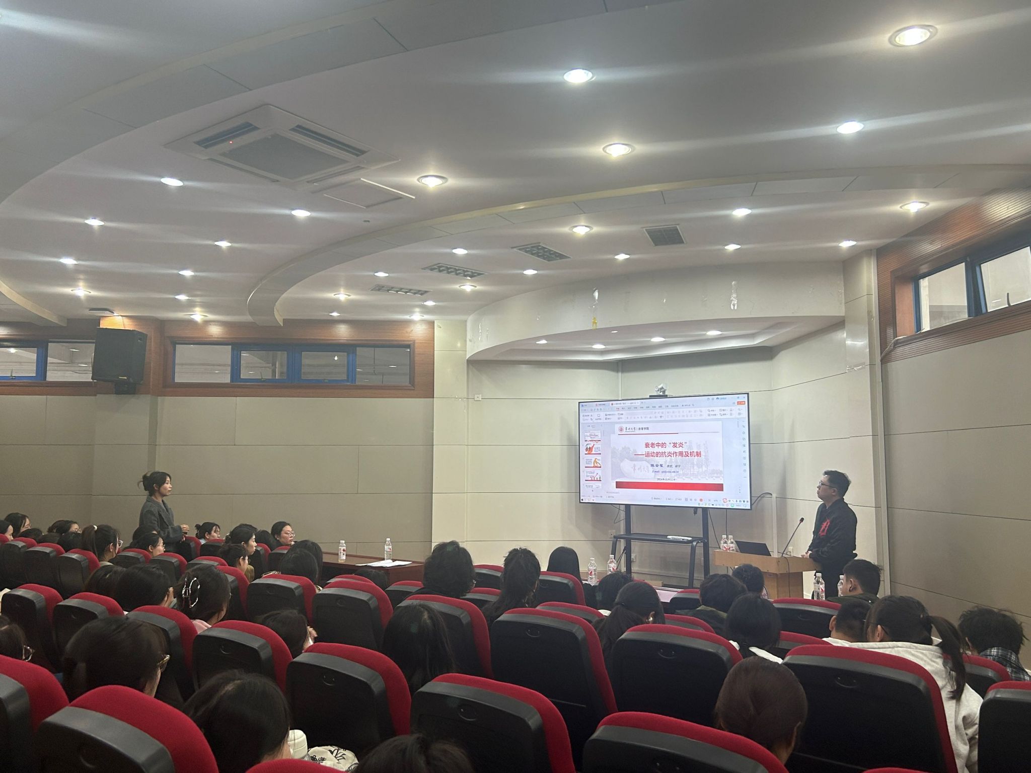 陈金鳌教授结合自身研究发现,阐述了慢性低度炎症的概念及其与衰老的密切关系,对运动在衰老中的抗炎作用进行了详细解释,特别介绍了适合老年人群的运动方式,同时提到了精准运动处方,运动的形式、频率、时长、强度对慢性低度炎症的影响。师生就如何通过科学研究和实践应用,更好地理解和应对衰老过程中的炎症问题,展开了热烈的讨论和交流。