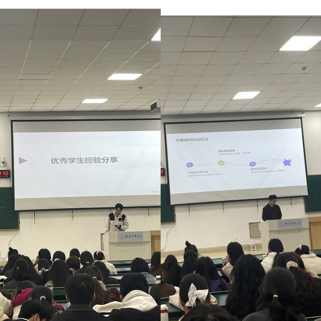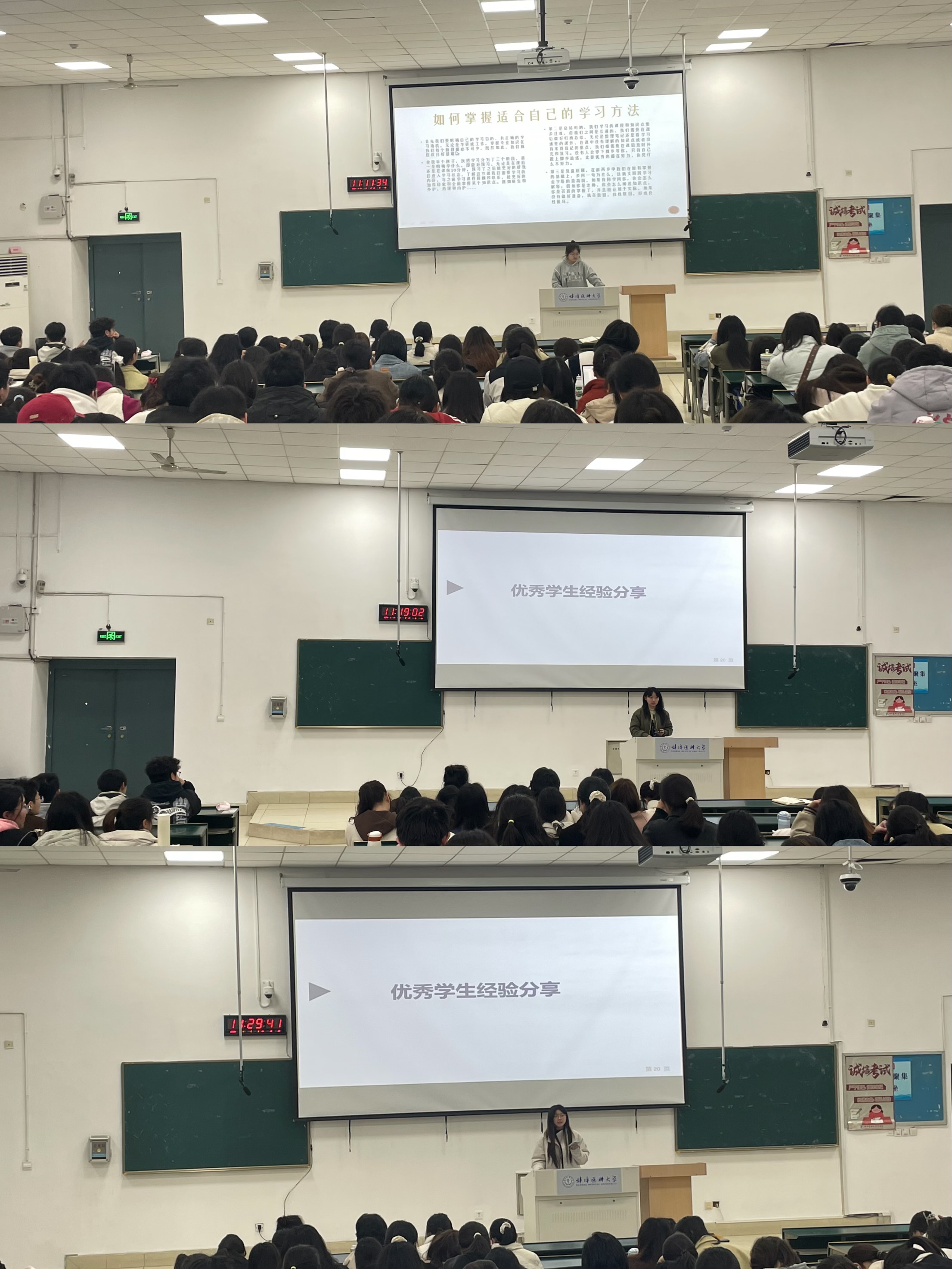 年级大会还邀请了助产学专业金慧婷、护理学专业李靖童、钱子鸣、曹贺、钱佳5名优秀学生代表给同学们做经验交流,几位同学从时间管理、学习方法、专注力提升等方面分享实践经验。发挥朋辈引领作用,以优秀典型为镜,鼓励学生将规划转化为行动。