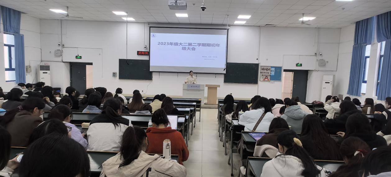 2023级全体学生在理论楼T2教室召开新学期年级大会。本次会议由辅导员张叶群主持,年级大会围绕学业总结、新学期规划、学习方法分享及学生活动动员等内容展开,旨在帮助学生明确目标、提升学习效率,以积极姿态迎接新学期挑战。