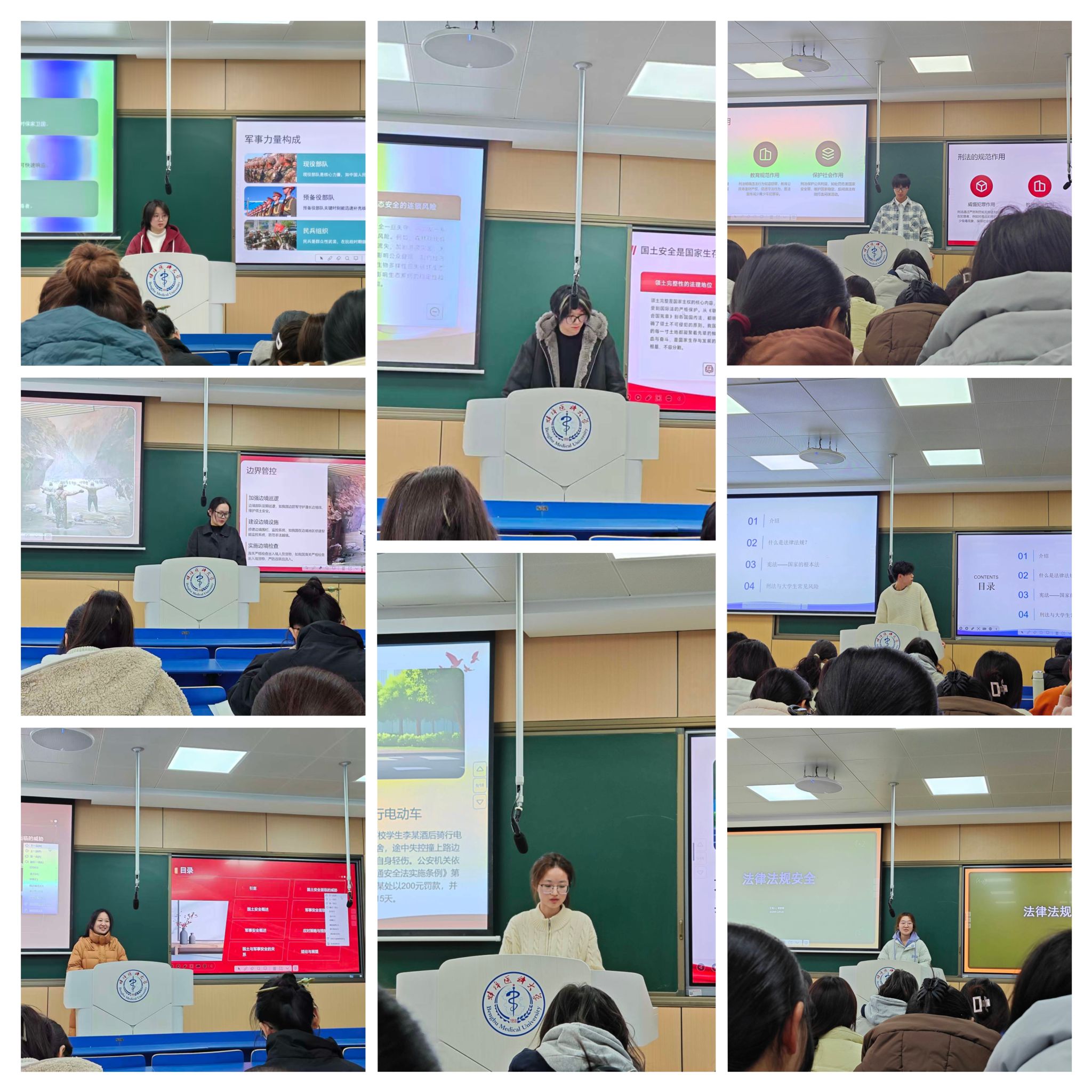 同学们紧扣主题分层递进展开分享:围绕“法律法规安全”,结合校园实际与护理专业特色,深入解读《宪法》核心要义与校规校纪,明晰日常行为的法律边界,梳理医护执业的相关法律准则;聚焦“国土与军事安全”,系统讲解国土安全与军事安全的核心内容,分析当前国土与军事安全面临的挑战,阐述青年学子维护国家安全的可行路径。讲座中通过趣味问答、案例分析、生活实例等形式,用生动的语言传递安全防护与责任担当的重要意义。