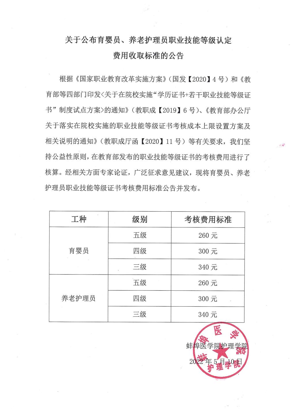 关于公布育婴员、养老护理员职业技能等级认定费用收取标准的公告