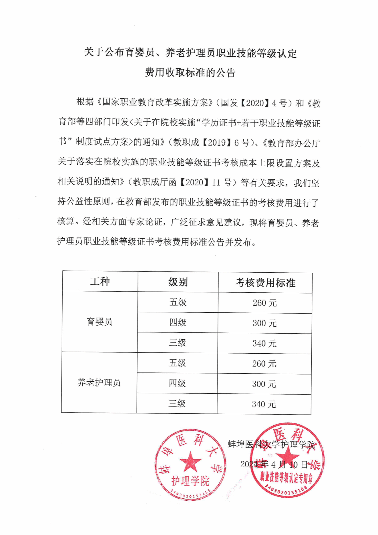 关于公布育婴员、养老护理员职业技能等级认定费用收取标准的公告