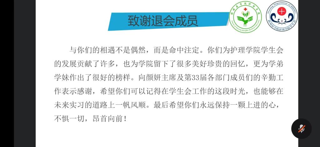 学生会成员退会仪式。第33届成员代表颜妍同学对任内工作进行总结汇报,对退会成员的辛勤工作表示充分的肯定和感谢,同时也为新一届学生委员提出宝贵意见。最后,第34届主席团成员代表张艺馨同学对接下来的工作做出规划,表示将不负老师和同学们的信任和期望,积极带领广大同学共同进步。