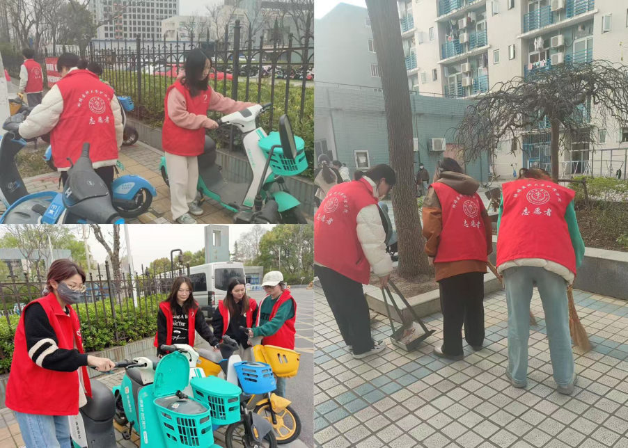 护理七班,八班组织学生志愿者开展校园清洁志愿服务活动。志愿者们身着红色马甲,手持扫帚、垃圾夹、抹布等工具,走进寝室广场。对广场地面、绿化带、公共座椅等区域进行全方位清扫,并对宣传栏进行擦拭消毒。活动过程中,志愿者还向过往同学宣传环保理念,呼吁大家共同维护校园环境。随后,志愿者们来到校门口共享单车停放区。针对早高峰后单车摆放散乱、占道等问题,志愿者们将倒伏车辆逐一扶正,并对车筐内残留垃圾进行清理,为师生提供更安心的骑行环境。活动期间,志愿者主动引导使用者规范停车,倡导文明出行。