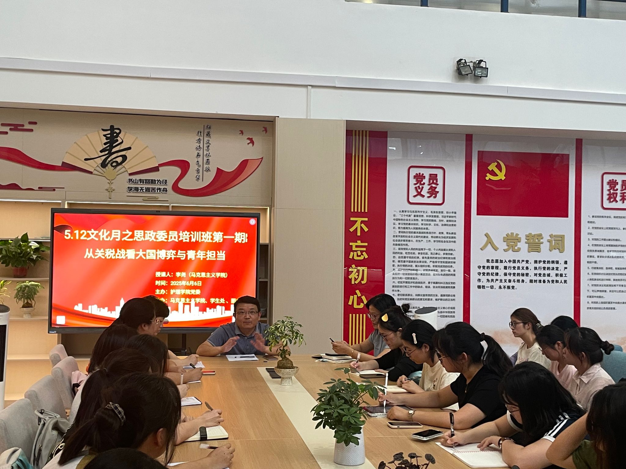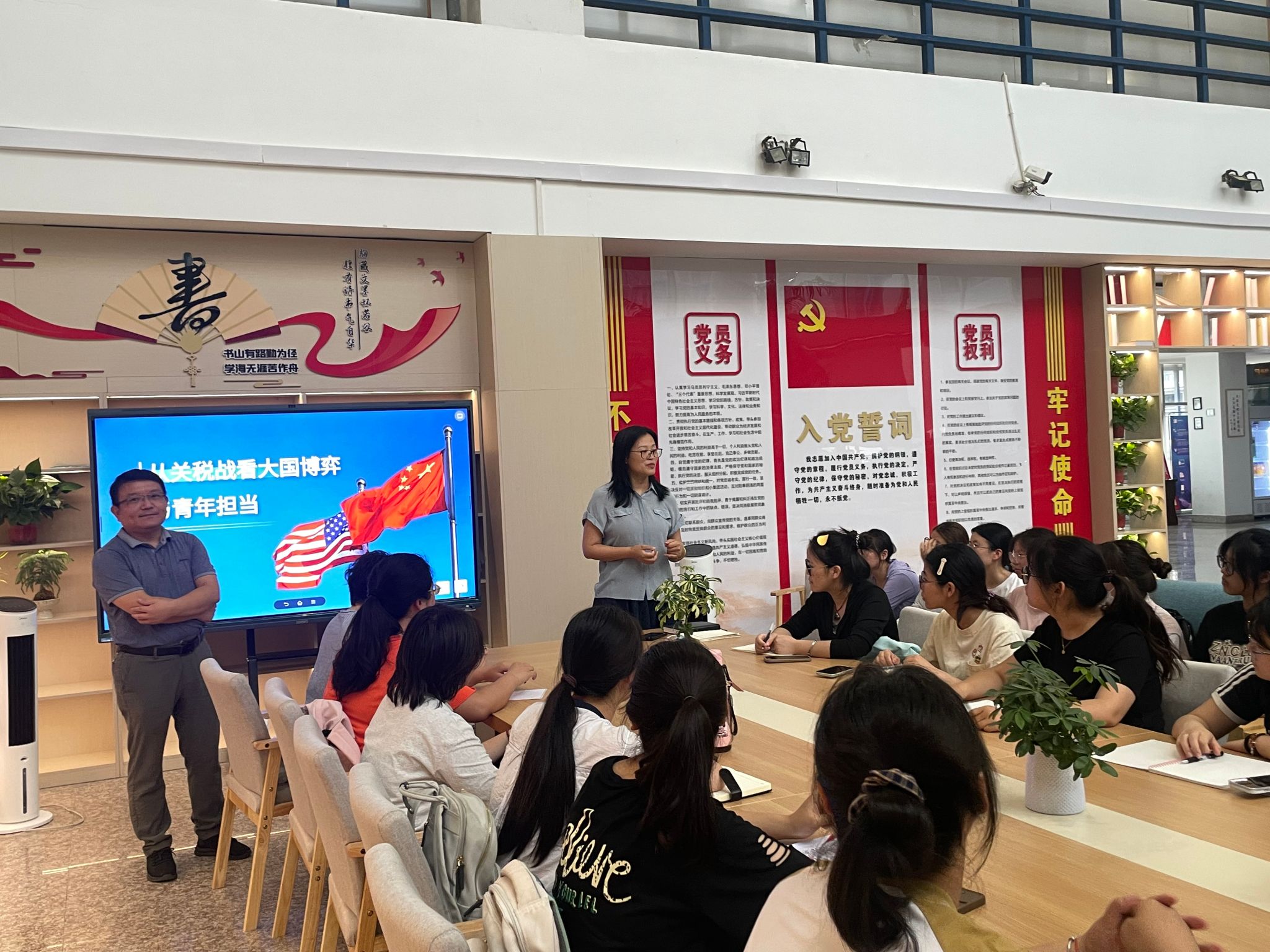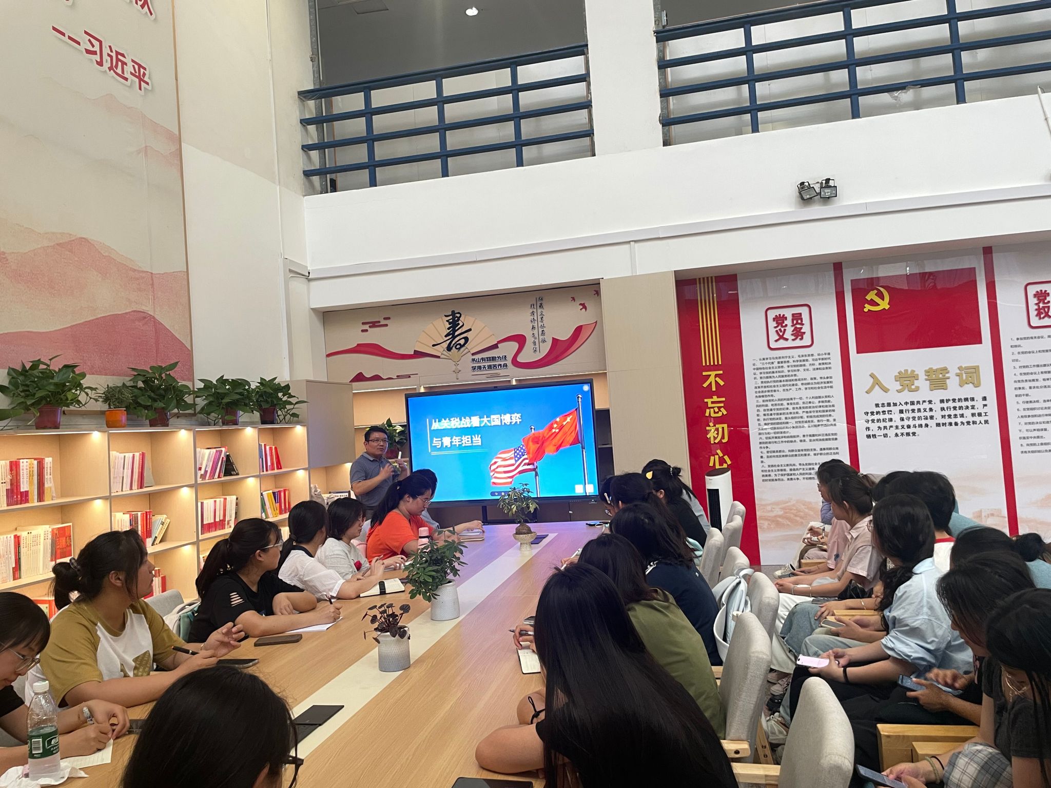 党委联合学生处、马克思主义学院、图书馆举办,马克思主义学院李尧老师主讲,主题为 “从关税贸易战到大国博弈与青年担当”。