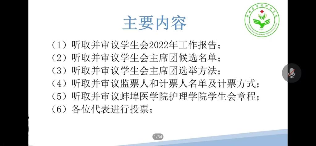 会议伊始,刘锦秀老师致开幕辞,肯定了学生会这一年工作、对学生会未来工作提出了要求,并希望同学们积极参与我院即将开展的5.12文化月活动和社会实践志愿服务活动。随后,颜妍同学宣读学生会2022年工作报告。大会依次听取并审议通过了《蚌埠医学院肉视频 学生会章程(修正案)》《蚌埠医学院肉视频 2023年度学生代表大会选举方法(草案)》。最后,刘锦秀老师宣布肉视频 2021年级戴婕、2022年级张艺馨、2022年级陆思雨为34届主席团成员。