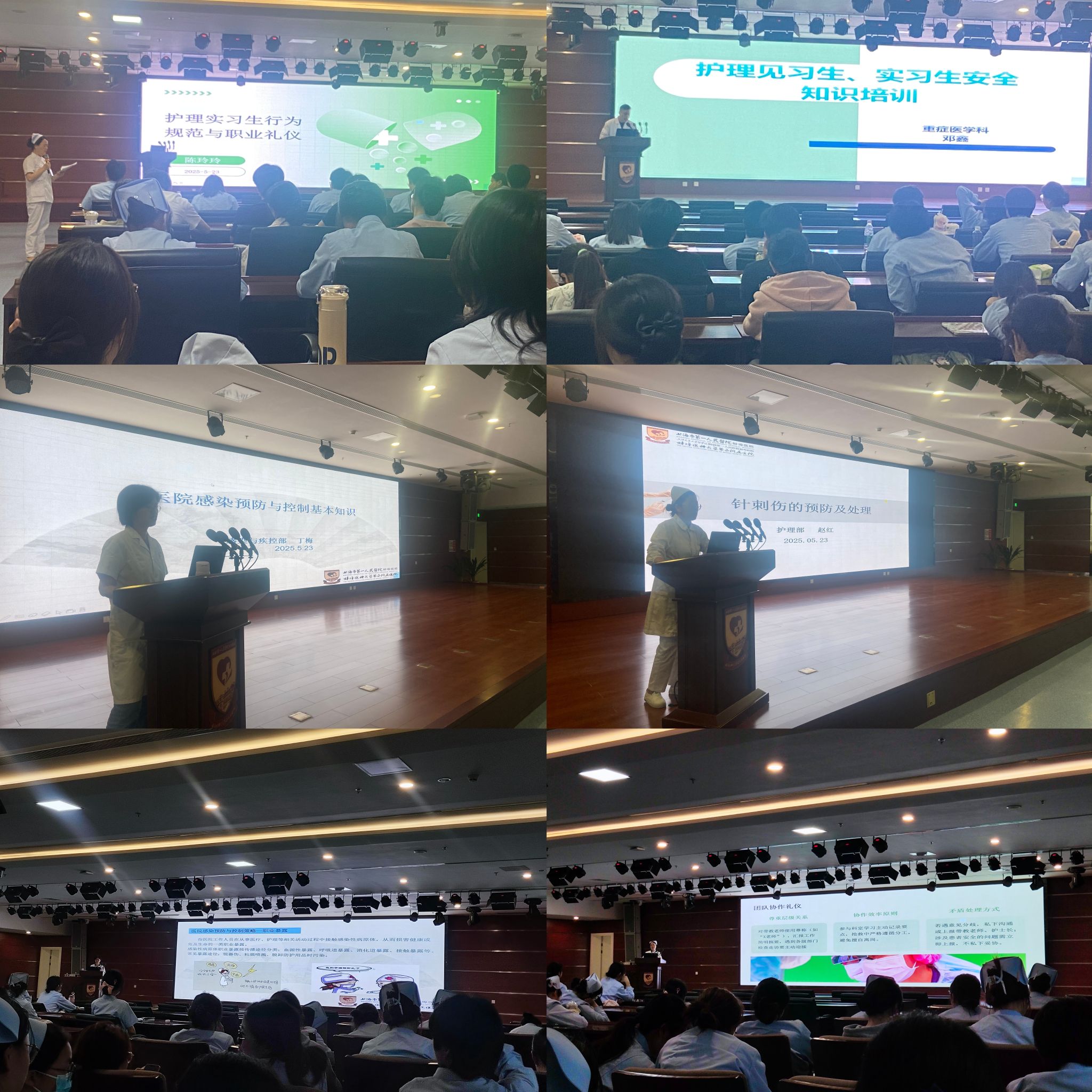 1.校院联合:夯实职业安全根基,筑牢临床防护屏障。5月19日至23日,第一附属医院护理部结合见习安排以“小组化实训”模式深入各科室,开展针对性临床安全教育;第二附属医院护理部则通过集中授课形式,系统讲解安全规范。培训内容涵盖四大核心模块:护士职业行为规范与礼仪标准、医院感染预防与控制实操、针刺伤预防及职业暴露应急处理、见习实习通用安全准则。通过理论讲解与情景模拟相结合的方式,参训学生不仅深化了对职业安全认知,更提升了医患沟通技巧与风险化解能力,为集中实习奠定了坚实的安全基础。